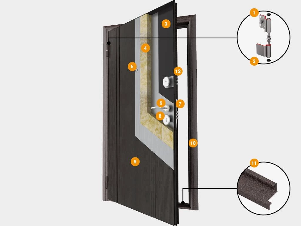 • снаружи полотно покрыто антивандальной порошковой краской цвета «антик медь» и имеет декоративный оттиск «симметрия»; изнутри на полотно наносится ПВХ-пленка цвета «венге» или «капучино мелинга»;