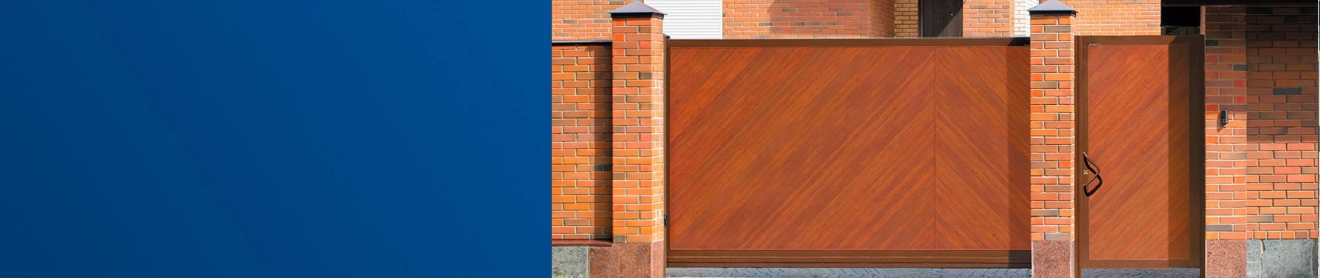 Наполнение – окантованные алюминиевым молдингом сэндвич-панели с имитацией фактуры древесины. Цвет стандартный по палитре RAL или эксклюзивный на выбор заказчика. Декором служат изящные кованые пики, они же одновременно являются дополнительной защитой от попыток проникновения извне.